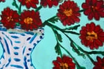 This is an original acrylic painting of a floral arrangement. The blue and white vase design was inspired by a favorite painter of mine, Henri Matisse. The bouquet is of dark red carnations. The style is a melding of folk art and modernism. The background is one of my favorite colors, turquoise. Shading has been added and the sides of the canvas are painted a reddish-brown. It is ready to hang, but a frame could be added if desired.